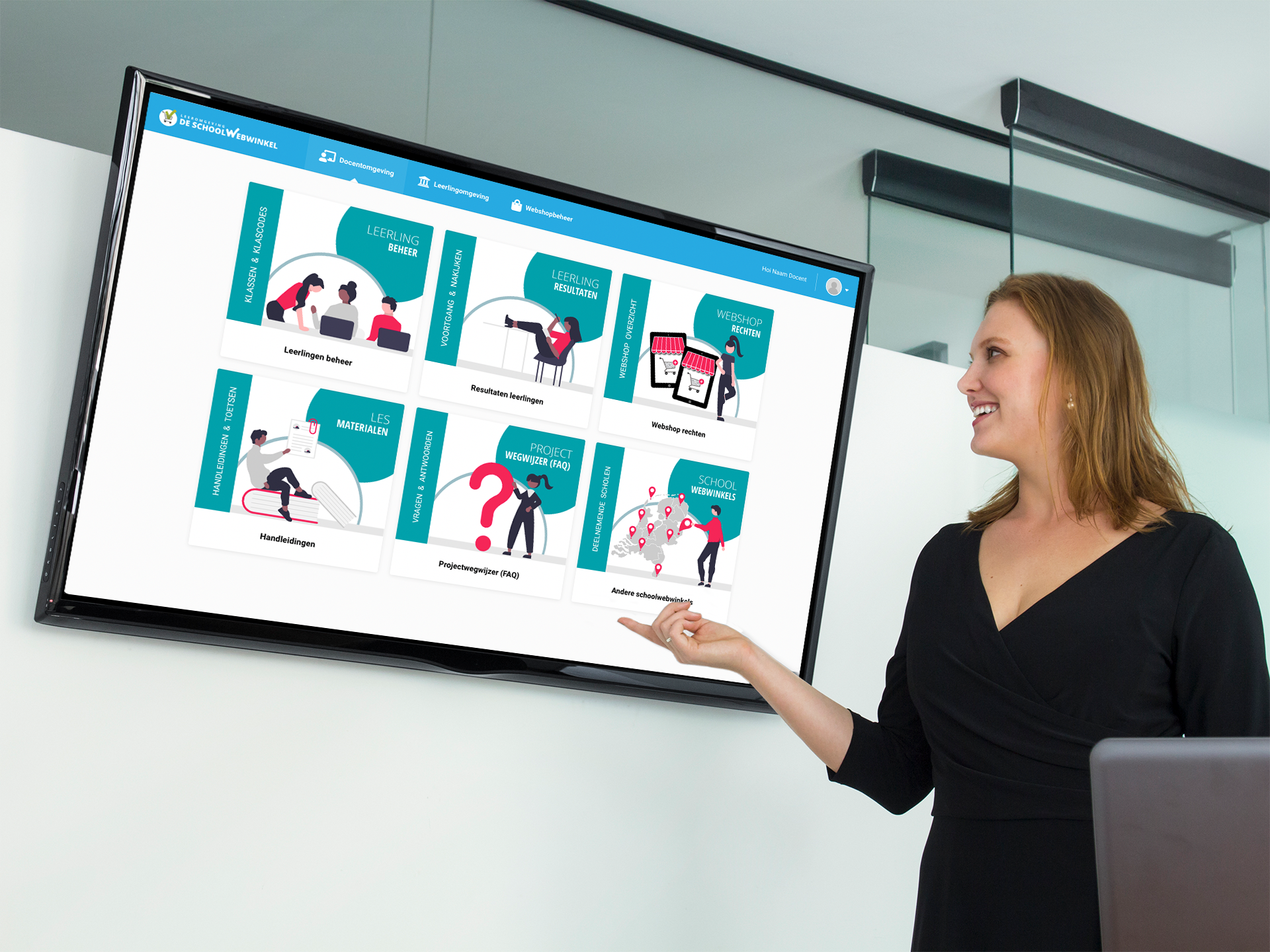 De Schoolwebwinkel werkt vanuit één overzichtelijk platform. Hierin staan – afhankelijk van de gekozen variant – alle theorie, verwerkingsvragen, praktijkopdrachten, CMS-opdrachten en de webshopomgeving (inclusief CMS-handleiding).